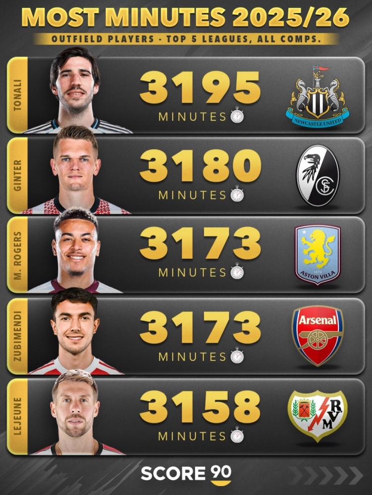 3月3日讯 Score90统计出了本赛季五大联赛迄今为止,各项赛事出战比赛时间最多的30名非门将球员,水晶宫的拉克鲁瓦以3540分钟居首,利物浦队长范戴克以3510分钟位居第三。
