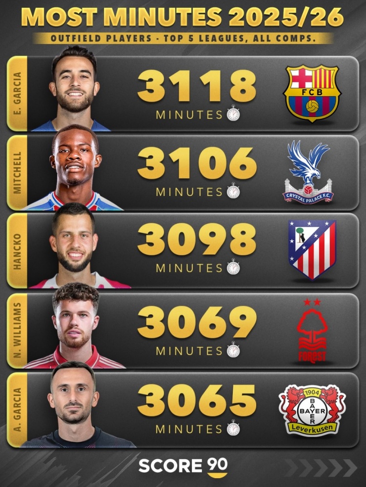 16、埃里克·加西亚(巴萨):3118分钟
