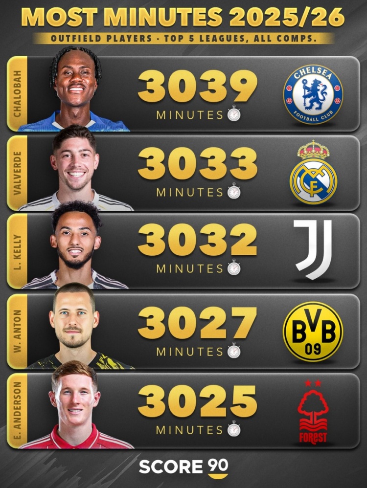 pgslot-本赛季五大联赛非门将球员出场时间榜:范戴克3510分钟第三