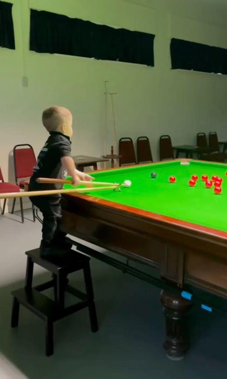 画面很诡异,孩子甚至没斯诺克球台高,只能爬凳子上玩;结果他手上功夫甚至要令不少成年人汗颜。
